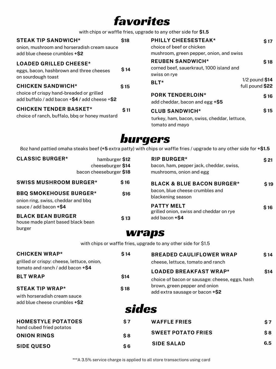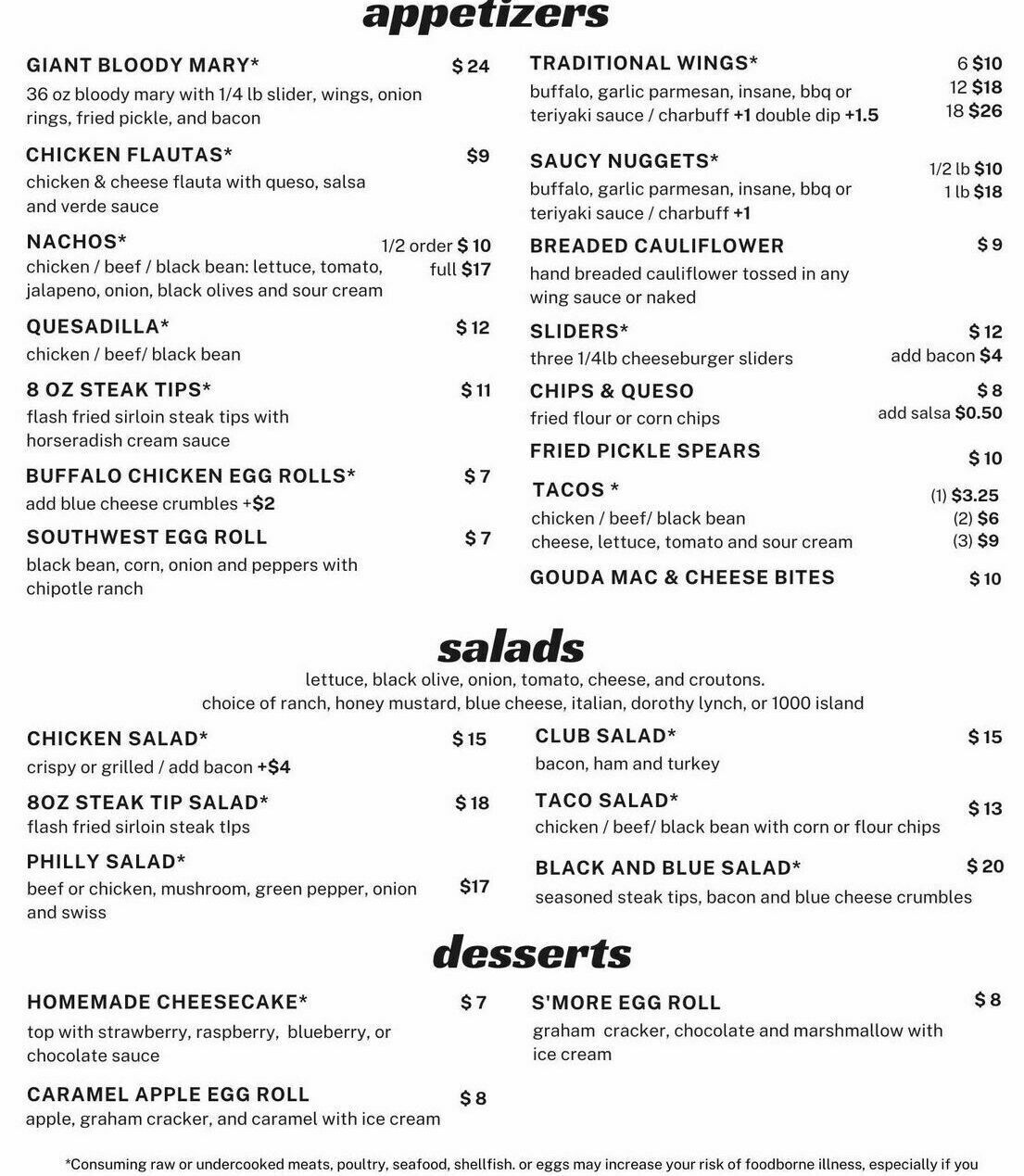 Take a look through our full menu and find your favorites — from fresh ½-lb burgers and tacos to pub classics, appetizers, salads, and desserts. Whether you’re grabbing a quick lunch, planning a game-day feast, or just craving something satisfying, there’s something for every mood.