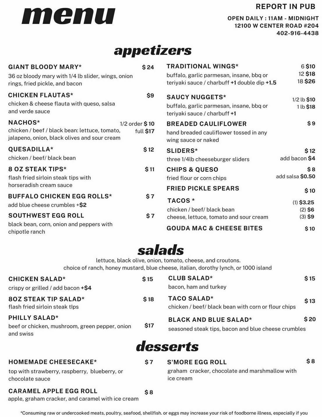 Specials & Events updated frequently on our Facebook page: www.facebook.com/reportinpubomaha